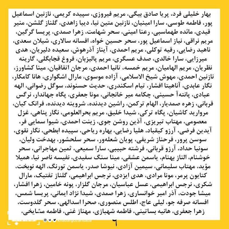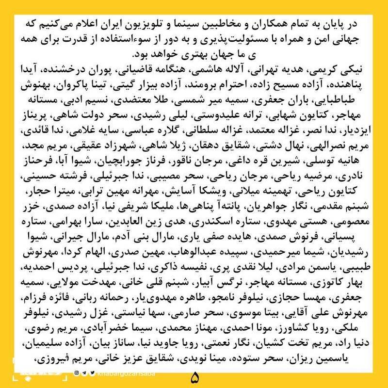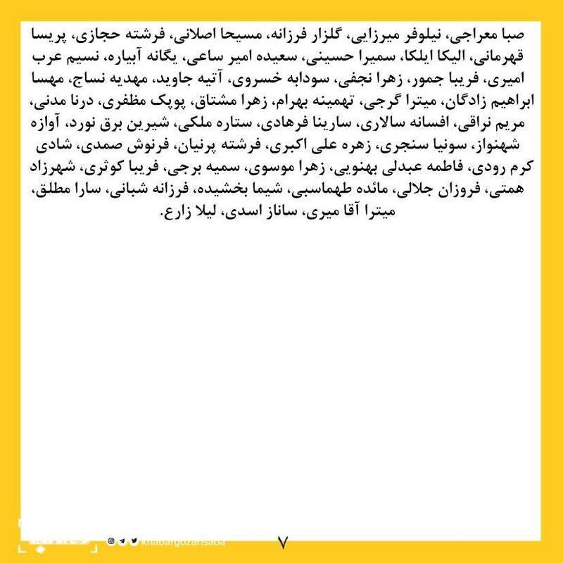 در بیانیه اعتراضی که در روز پنجشنبه ۱۱ فروردین (۳۱ مارس) منتشر شده است، نام زنان سرشناسی از سینمای ایران به چشم میخورد.