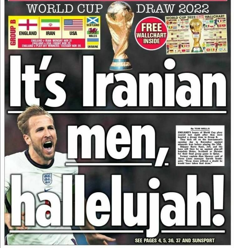 نشریه سان اسپورت قرعه تیم ملی انگلیس در جام جهانی را بسیار خوب توصیف کرده است . تیم ملی انگلیس در گروه دوم رقابت های جام جهانی به مصاف تیم های امریکا ، ایران و برنده پلی اف اروپا خواهد رفت . در این مطلب تیتر جنجالی روزنامه انگلیسی در مورد هم گروه شدن با ایران را می خوانیم .