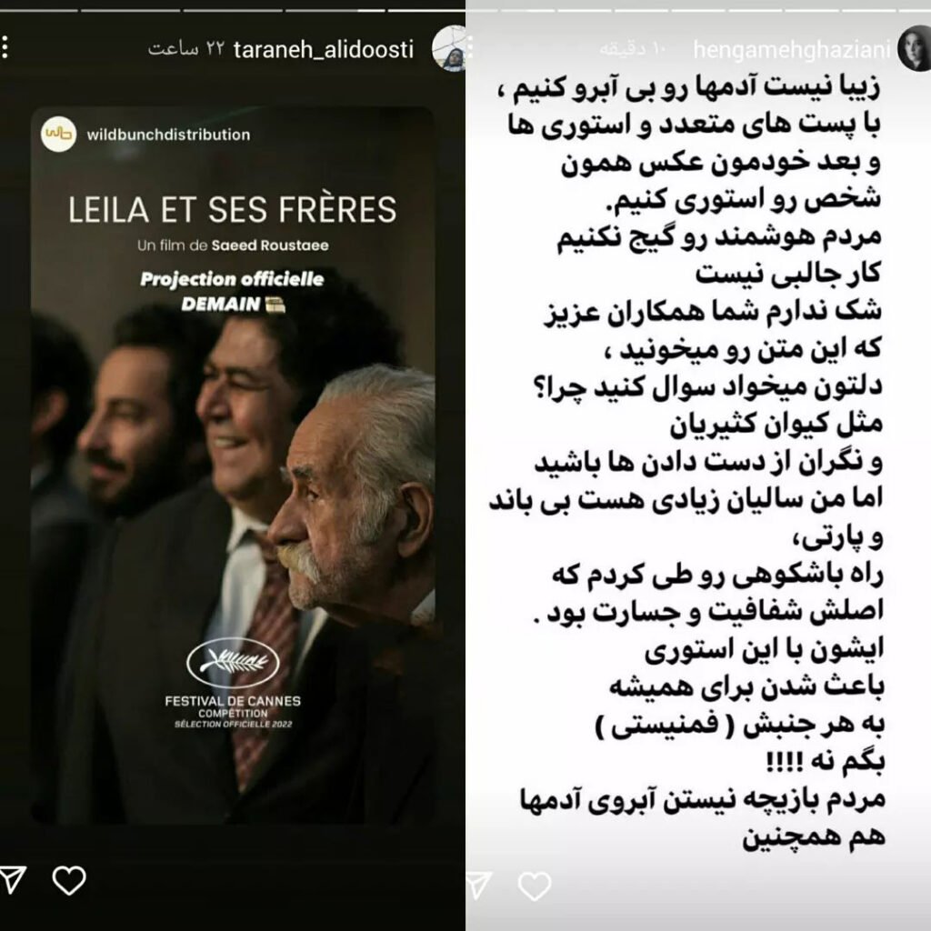 به دنبال همین حواشی، هنگامه قاضیانی ، بازیگر سینمای ایران واکنش نشان داد و در استوری اینستاگرامش نوشت: زیبا نیست آدمها رو بیآبرو کنیم، با پستهای متعدد و استوریها و بعد خودمون عکس همون شخص رو استوری کنیم. مردم هوشمند رو گیج نکنیم. کار جالبی نیست. شک ندارم شما همکاران عزیز که این متن رو میخونید، دلتون میخواد سوال کنید چرا؟ و نگران از دست دادنها باشید اما من سالیان زیادی هست بیباند و پارتی، راه باشکوهی رو طی کردم که اصل شفافیت و جسارت بود. ایشون با این استوری باعث شدن برای همیشه به هر جنبش (فمینیستی) بگم نه!!! مردم بازیچه نیستن آبروی آدمها هم همچنین.