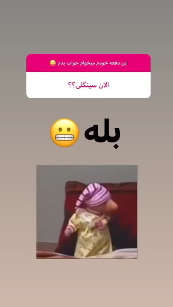 او همچنین در پاسخ به پرسش یکی از طرفدارانش در خصوص وضعیت تاهل کنونی اش گفت: الان سینگلم!