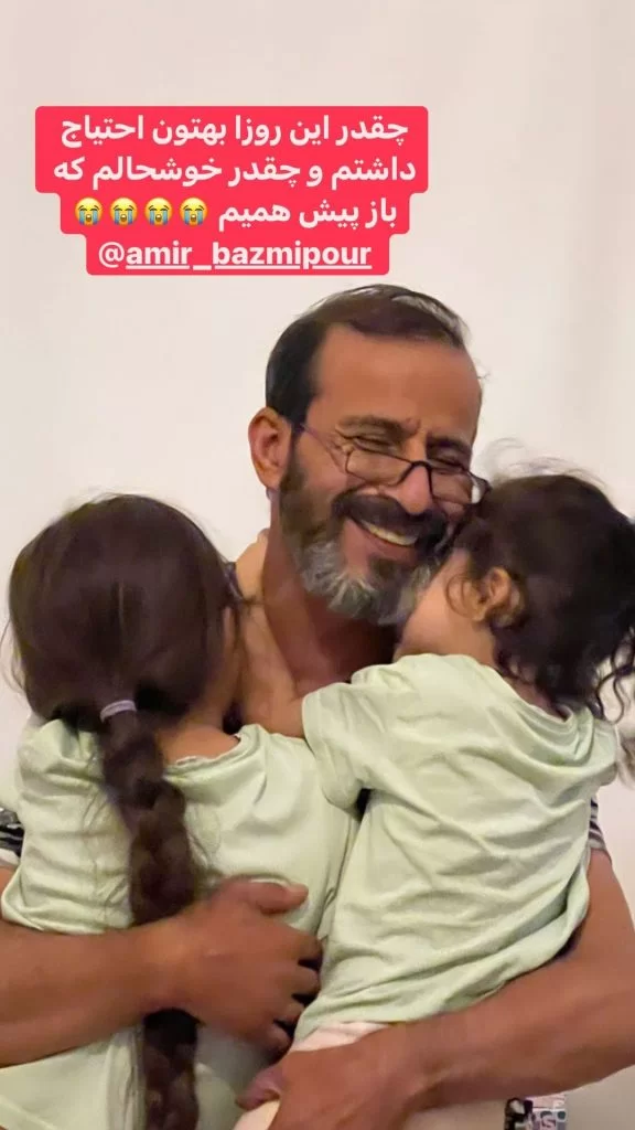 همسر شاهرخ استخری از استیکر گریه استفاده کرده و در حاشیه این تصویر که دو دخترش را در آغوش پدرش نشان می دهد، نوشته است: